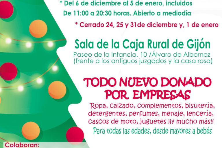 Un año más, la sala de la Caja Rural de Gijón (Paseo de la Infancia 10) acogerá entre el 6 de Diciembre y el 5 de Enero una nueva edición de nuestro mercadillo de Navidad. En el mercadillo se pueden encontrar artículos muy variados para todas las edades como ropa, calzado, complementos, bisutería, perfumes, productos…