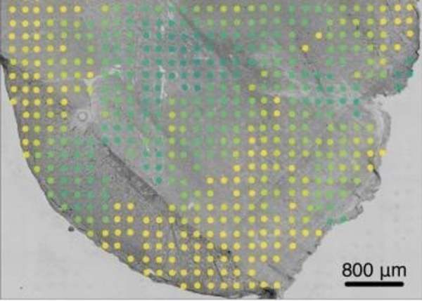 Para el nuevo estudio, los autores emplearon un enfoque innovador desarrollado recientemente por Vickovic y sus colegas. El método consiste en colocar muestras de tejido fino en portaobjetos de vidrio, con cada portaobjeto cubierto por 1.007 puntos diminutos. Cada punto es aproximadamente del tamaño de un ácaro del polvo y contiene moléculas que capturan el ARNm.